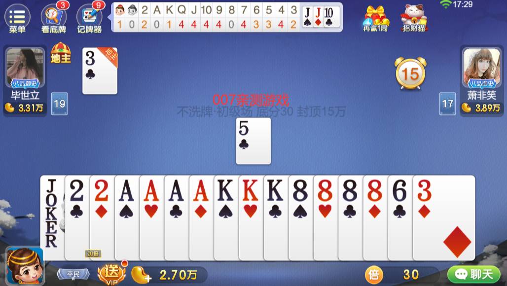 3、对于四个的就是炸弹,还有就是两个王是最大的,可以压住2222.炸弹一出是要翻倍的。还有就是4个可以带两个单或者两个对。